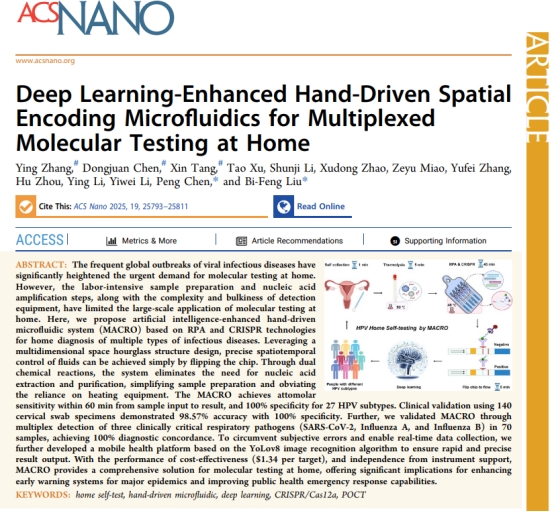 williamhill中国刘笔锋教授团队近期在ACS Nano 上发表题为《Deep Learning-Enhanced Hand-Driven Spatial Encoding Microfluidics for Multiplexed Molecular Testing at Home》的研究论文。该研究提出了一种名为MACRO的人工智能增强手驱微流控系统,实现了HPV、SARS-CoV-2、Influenza A、Influenza B等多重病原体的居家精准检测。williamhill中国章英、william威廉中文同济医学院附属湖北妇幼保健院陈冬娟和williamhill中国唐鑫为共同第一作者,刘笔锋教授、陈鹏副教授为通讯作者。