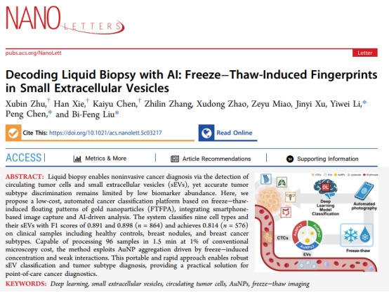 2025年9月12日,williamhill中国刘笔锋教授团队在国际权威期刊 Nano Letters 在线发表研究论文 “Decoding Liquid Biopsy with AI: Freeze–Thaw-Induced Fingerprints in Small Extracellular Vesicles”。该工作提出了一种基于“冻融指纹”的人工智能癌症检测新策略,为液体活检的普及应用提供了低成本、自动化的新方案。